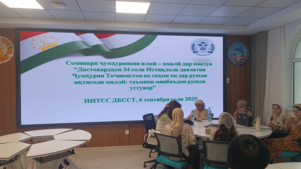 Тибқи нақшаи баргузории семинару ҳамоишҳои илмӣ бахшида ба 34-умин солгарди Истиқлолияти давлатии Ҷумҳурии Тоҷикистон Институти илмию таҳқиқотии сайёҳӣ ва соҳибкории ДБССТ ва Институти иқтисоди ҷаҳон ва муносибатҳои байналмилалӣ рӯзи 6 сентябри соли равон семинари ҷумҳуриявии илмӣ-амалиро дар мавзуи “Дастовардҳои 34 соли Истиқлолияти давлатии Ҷумҳурии Тоҷикистон ва саҳми он дар рушди иқтисоди миллӣ: таъмини минбаъдаи рушди устувор” бо иштироки ҳайати профессорону устодон доир намуд.