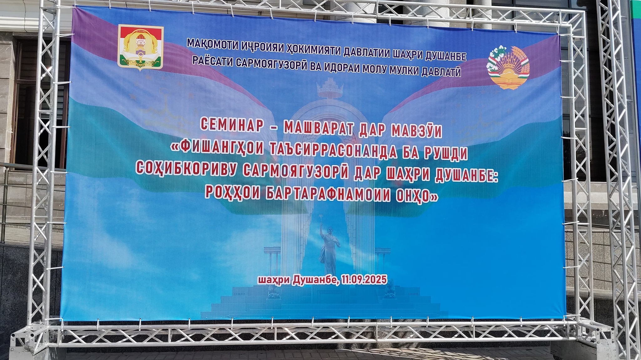 Санаи 11.09.2025 дар толори бинои Мақомоти иҷроияи ҳокимияти давлатии нохияи Сино, бо ташаббуси Раёсати сармоягузорӣ ва идораи молу мулки давлатии Мақомоти иҷроияи ҳокимияти давлатии шахри Душанбе Семинар-машварати илмию амали дар мавзуи "Фишангҳои таъсиррасонанда ба рушди соҳибкори ва сармоягузорӣ дар шахри Душанбе: роҳҳои бартарафнамоии онҳо" бо иштироки намояндагони Макомоти ичроияи хокимияти давлатии шахри Душанбе, Кумитаи давлатии сармоягузорӣ ва идораи амволи давлатӣ, Бонки миллӣ, Кумитаи андоз, Хадамоти гумрук, Институти илмию таҳқиқотии сайёҳӣ ва соҳибкории ДБССТ ва соҳибкорони шаҳри Душанбе баргузор гардид.