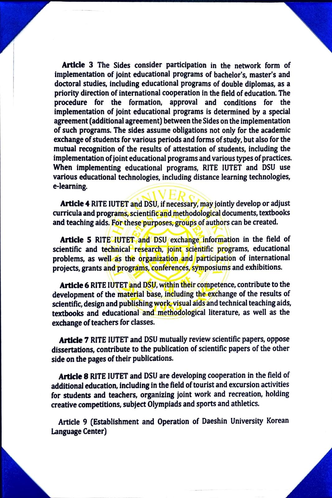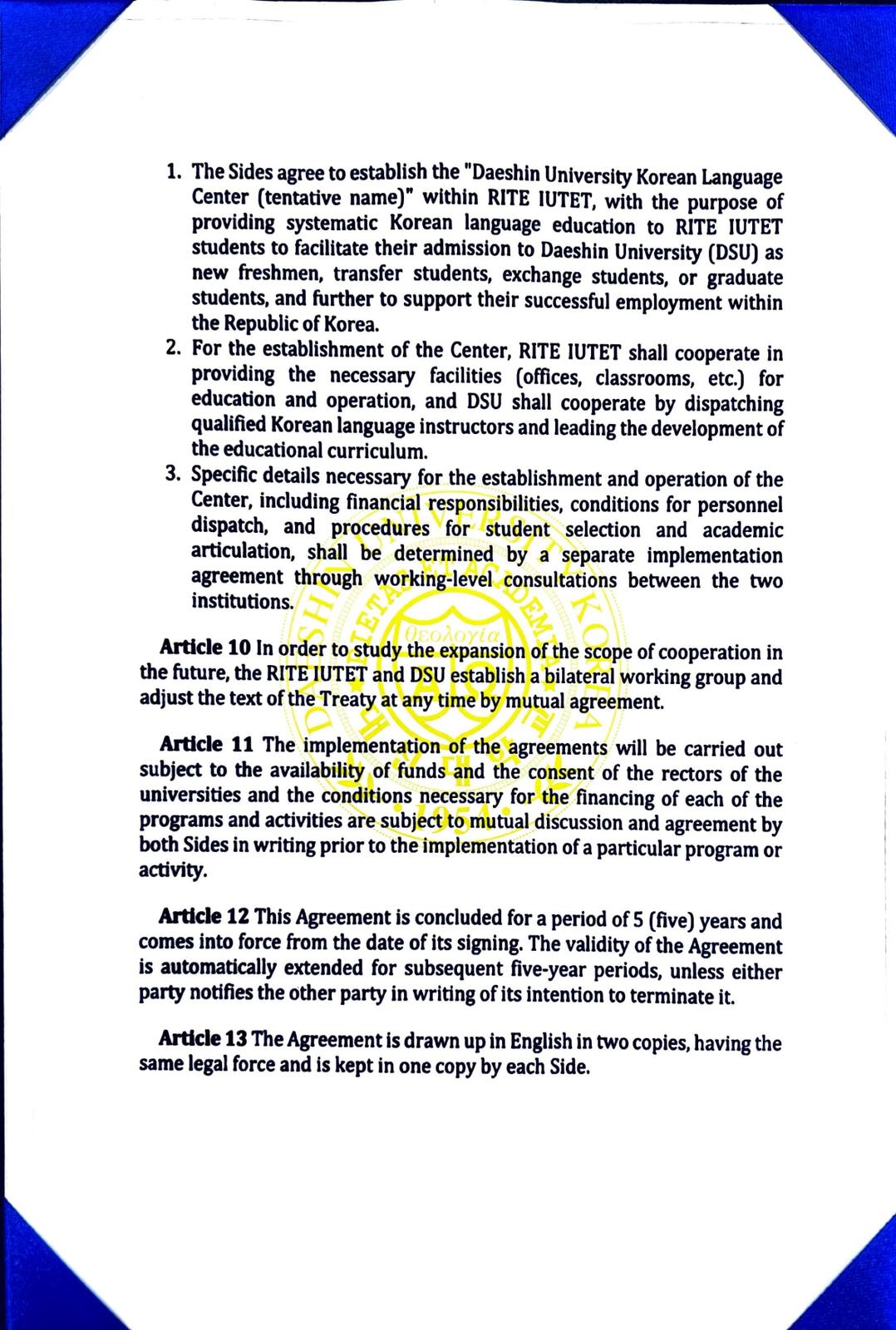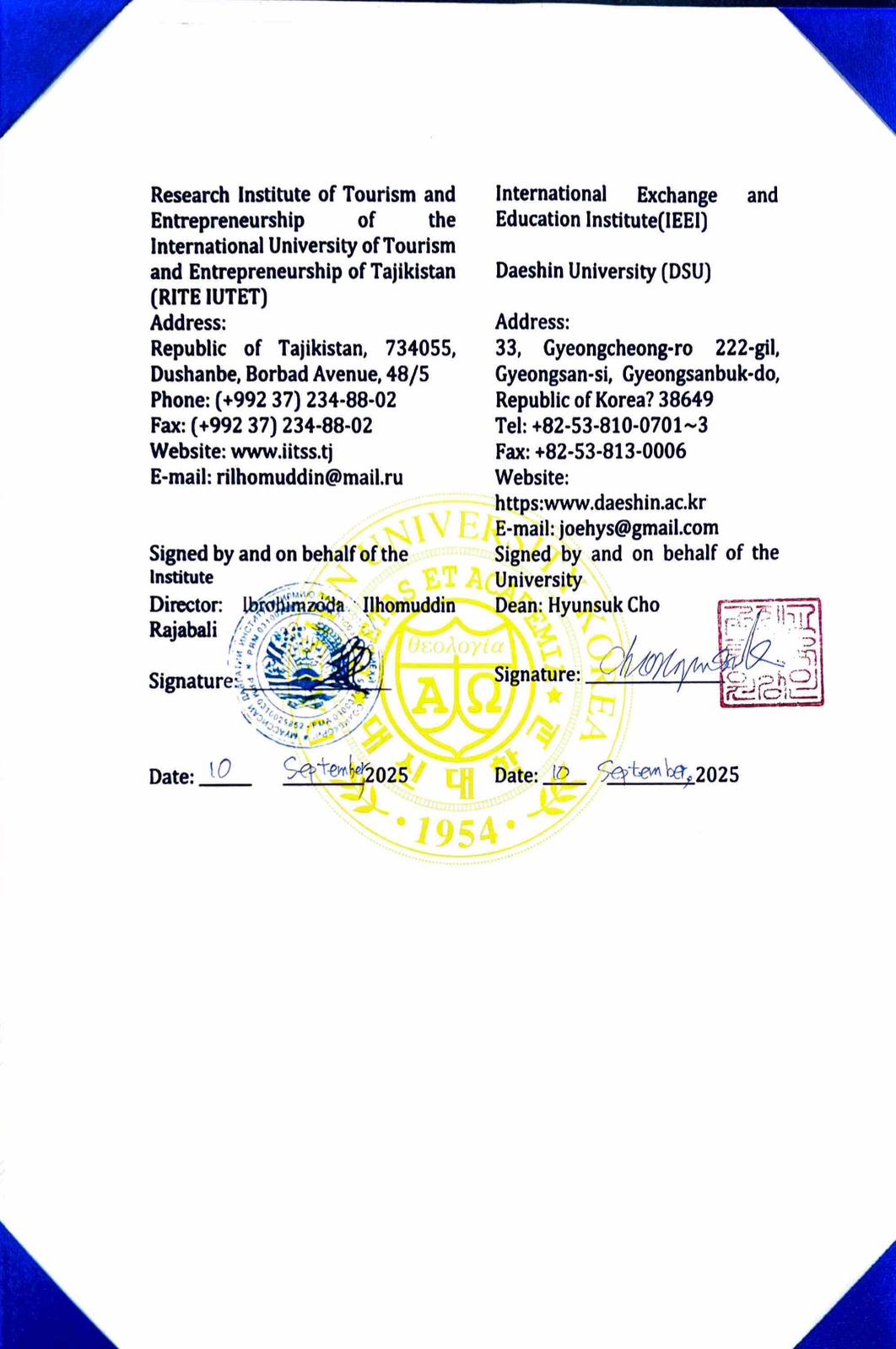 Санаи 10-уми сентябри соли 2025 байни Институти илмию таҳқиқотии сайёҳӣ ва соҳибкории Донишгоҳи байналмилалии сайёҳӣ ва соҳибкории Тоҷикистон шартномаи ҳамкорӣ бо Донишгоҳи Даешини Ҷумҳурии Корея ба имзо расонида шуд. Дар заминаи шартнома масъалаҳои табодули академии донишҷӯёну устодон, барномаҳои дудиплома, гузаронидани корҳои илмию таҳқиқотии муштарак, рушди муносибатҳо дар самти ҷалби сайёҳони байни ду кишвар, рушди муносибатҳо дар самти ташаккули бизнес-инкубаторҳо ва стартапҳо ҷиҳати рушди соҳибкорӣ, дигар самтҳои фаъолияти муштарак ва кушодани марказҳо дар доираи муқарраротҳои санадҳои меъёрии ҳарду ҷониб роҳандозӣ карда мешавад.